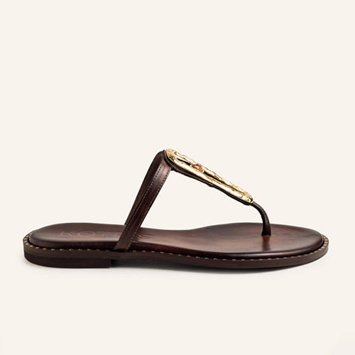 Sandalia plana de la marca Kotris. Fabricada en piel de alta calidad en color marrón. Modelo de tiras finas con original detalle en el empeine de bisutería bañada en oro y piedra transparente. Puntera redonda. Pequeñas tachas doradas alrededor de la planta. Plantilla acolchada. Suela de goma antideslizante.