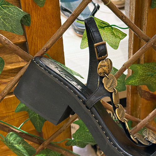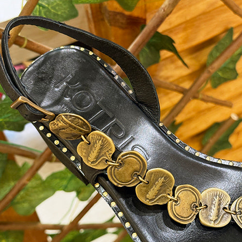 Sandalia estilo griego de la marca Kotris. Fabricada en piel color negro. Modelo de tira delantera y tacón medio. Cierre mediante tira con hebilla ajustable. Detalle de piezas doradas a lo largo del empeine. Suela de goma. Hechas a mano en Grecia.