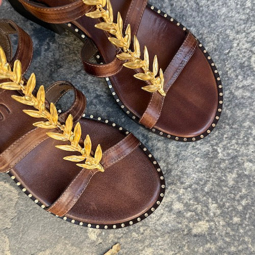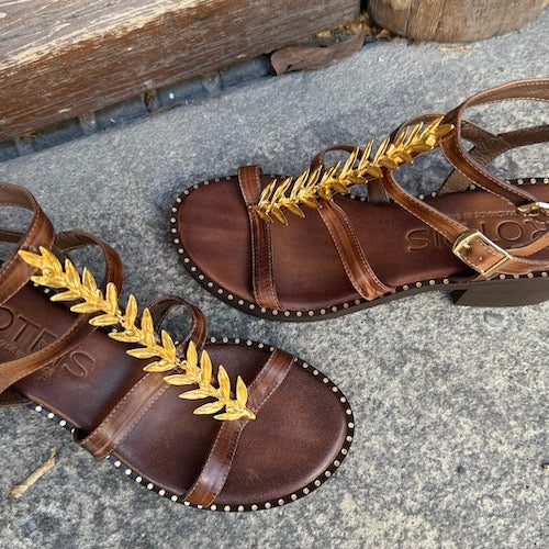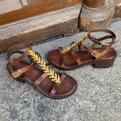 Sandalia estilo griego de la marca Kotris. Fabricada en piel color marrón. Modelo de triple tira y tacón medio. Cierre mediante tiras con hebillas ajustables. Detalle de piezas doradas a lo largo del empeine. Suela de goma. Hechas a mano en Grecia.