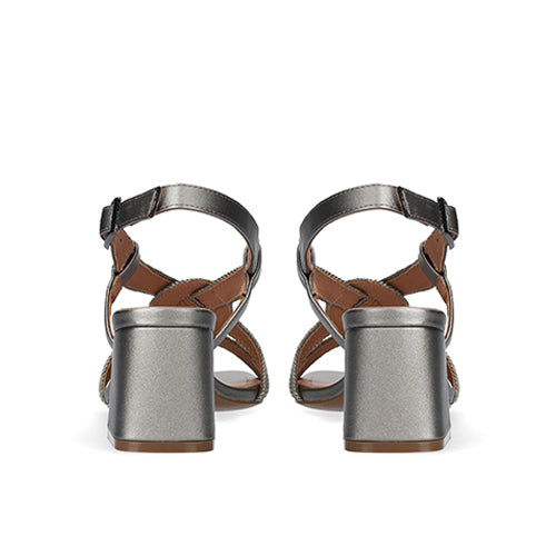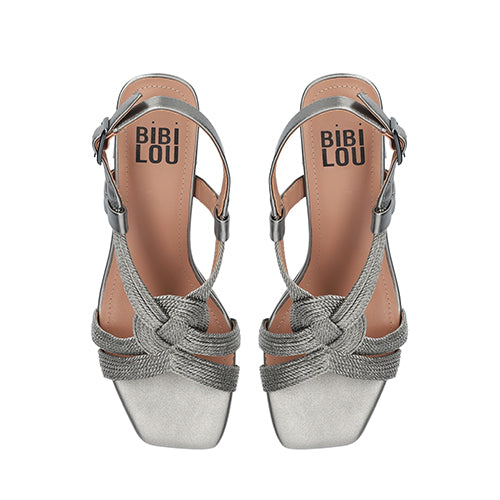 Sandalia de tacón de la marca Bibi Lou. Fabricada en material sintético efecto rafia en color estaño. Cierre mediante tira con hebilla ajustable a la altura del tobillo. Modelo de puntera semi-cuadrada. Suela de goma.