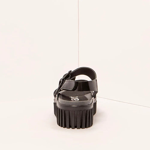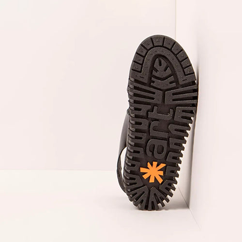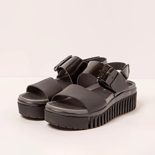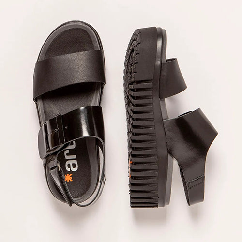 Sandalia con plataforma de la marca art. Fabricada en piel color negro. Modelo de doble tira, con cierre mediante maxi hebilla ajustable al tono. Tira trasera con velcro para un mayor ajuste. Combina tira delantera en piel mate y tira posterior piel brillante. Plataforma dentada al tono. Plantilla microfibra no extraíble. Suela softlight.
