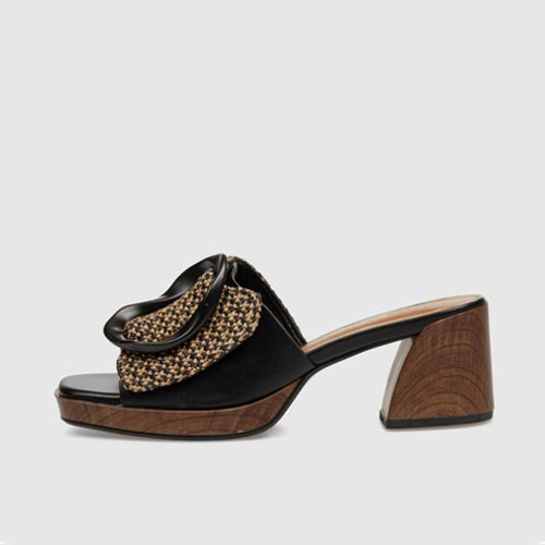 Zueco con plataforma y tacón medio de la marca Noa Harmon. Fabricado en combinación de rafia y napa vegana en colores camel y negro. Detalle de maxi hebilla ondulada en color negro. Forro y plantilla de piel. Suela de goma.