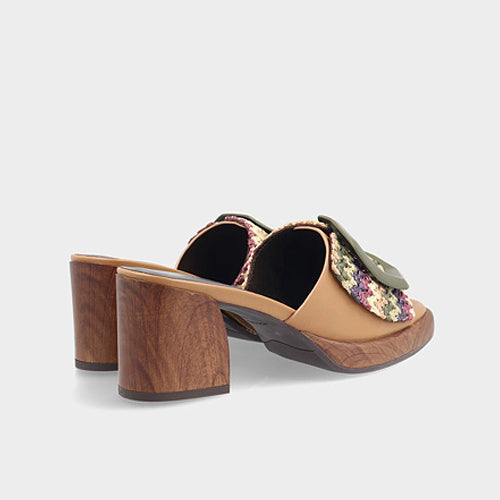 Sandalia estilo zueco de la marca Noa Harmon. Modelo fabricado en combinación de napa color camel y rafia multicolor. Detalle de original maxi hebilla en color kaki. Tacón medio y plataforma en material efecto madera. Forro y plantilla de piel. Suela de goma.