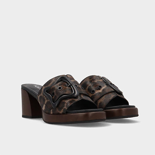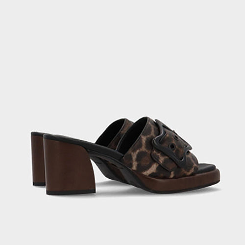 Sandalia estilo zueco de la marca Noa Harmon. Modelo fabricado en napa granulada en estampado animal print. Detalle de original maxi hebilla en color negro. Tacón medio y plataforma en material efecto madera. Forro y plantilla de piel. Suela de goma.