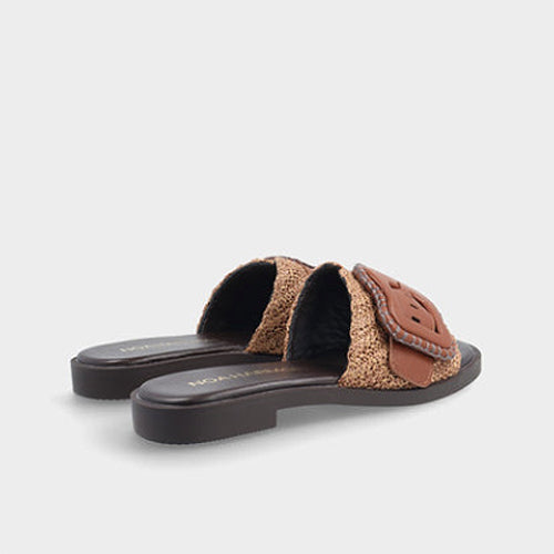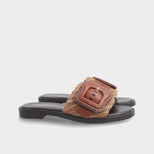 Sandalia plana de la marca Noa Harmon. Modelo estilo pala con tira superior en rafia color cuero. Adorno de hebilla en napa al tono. Forro y plantilla de piel. Suela de goma.