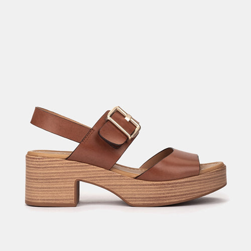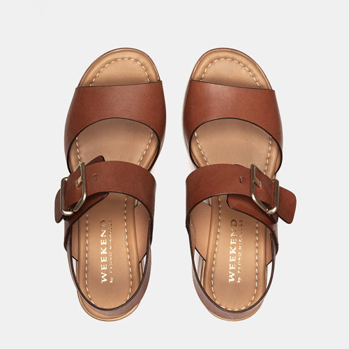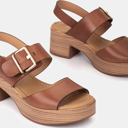 Sandalias de tacón y plataforma de la marca Pedro Miralles. Fabricada en piel color cuero. Diseño de doble tira con hebilla ajustable en la parte superior. Tacón y plataforma en conglomerado efecto madera. Tira trasera para una perfecta sujeción. Un modelo atemporal y versátil.