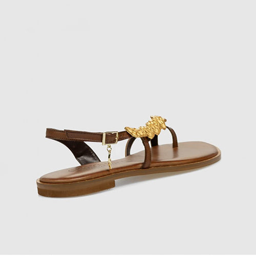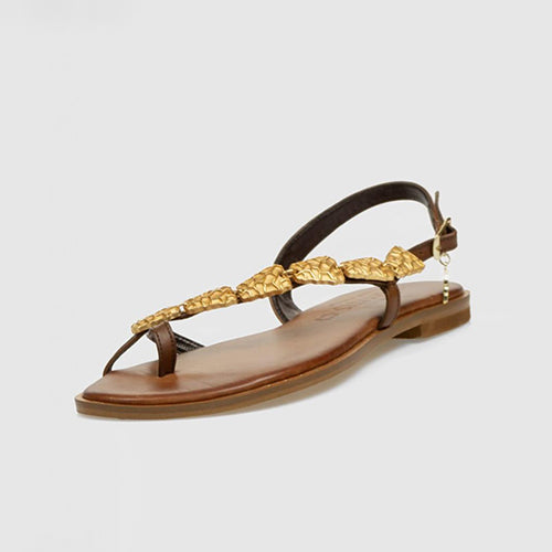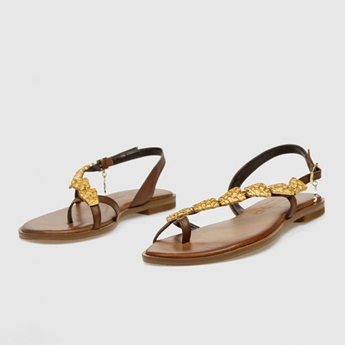 Sandalia estilo griego de la marca Caryatis. Fabricada en piel color cuero oscuro. Modelo de entrededo. Cierre mediante tira con hebilla ajustable. Detalle de piezas doradas a lo largo del empeine. Plantilla acolchada. Hechas a mano en Grecia.