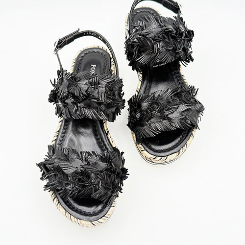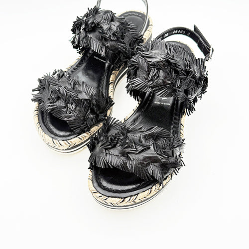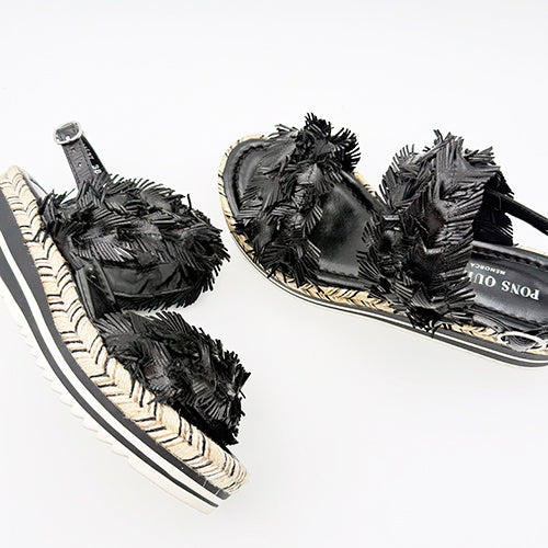 Sandalia plana de la marca Pons Quintana. Confeccionada en piel en color negro. Original modelo de doble tira con acabados despuntados. Cercos de yute natural. Cierre mediante tira con hebilla ajustable a la altura del tobillo. Piso bicolor a tono. Suela de goma antideslizante.
