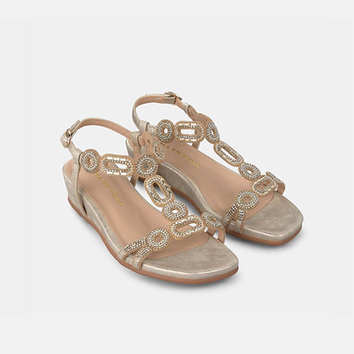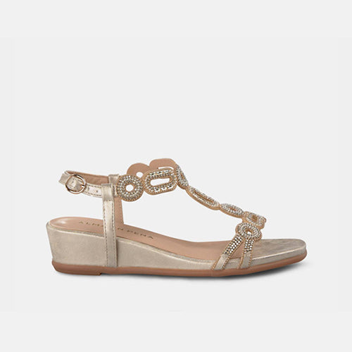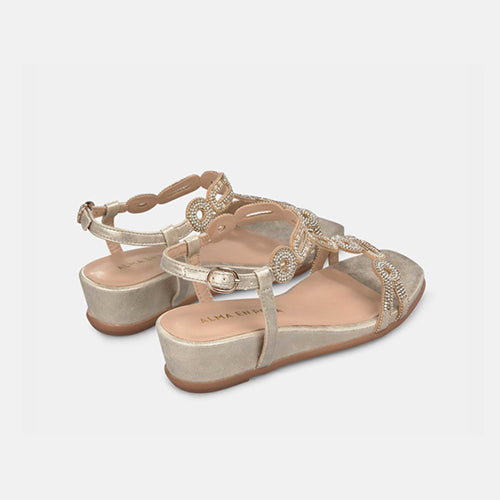 Sandalia de cuña baja de la marca Alma en Pena. Modelo de pedrería en color bronce. Cierre mediante tira con hebilla ajustable a la altura del tobillo. Suela de goma.