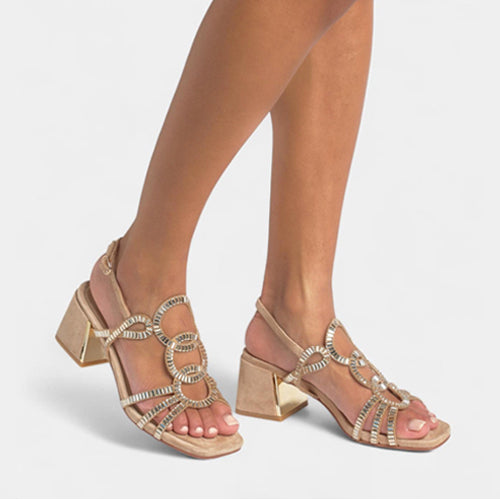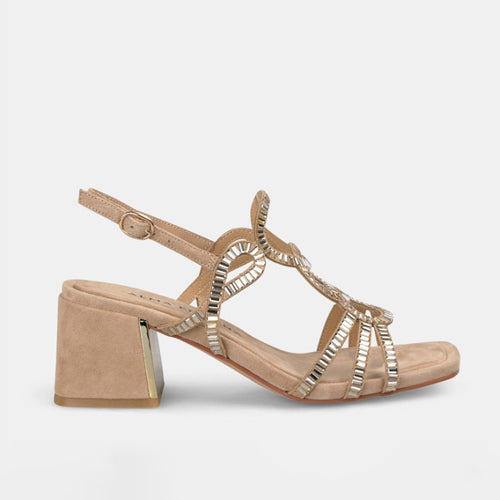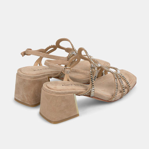 Sandalia de tacón medio de la marca Alma en Pena. Modelo de tiras con detalles tipo cristal en color camel, con formas circulares cubriendo todo el empeine. Puntera cuadrada. Tacón tipo bloque forrado al tono con detalle metalizado en color oro. Cierre mediante tira con hebilla ajustable a la altura del tobillo.