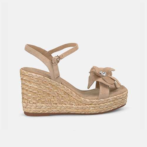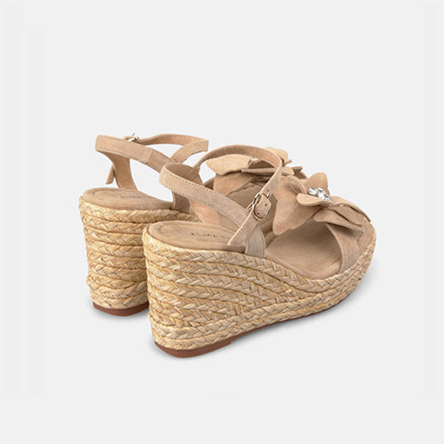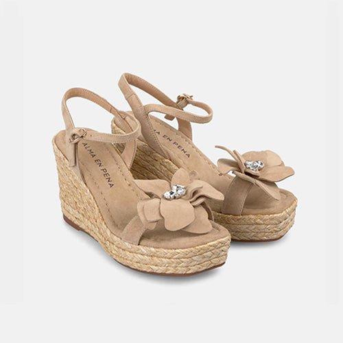 Sandalia de plataforma y cuña de la marca Alma en Pena. Original detalle de mega flor al tono con brillante en la parte delantera del modelo. Diseño de puntera cuadrada en color camel. Cierre mediante tira con hebilla ajustable a la altura del tobillo. Plataforma y cuña de esparto. Suela de goma.
