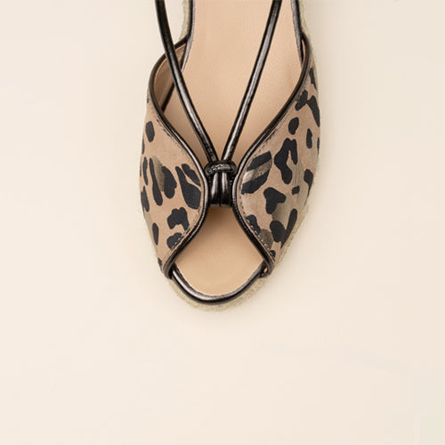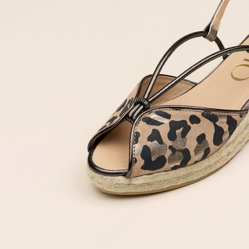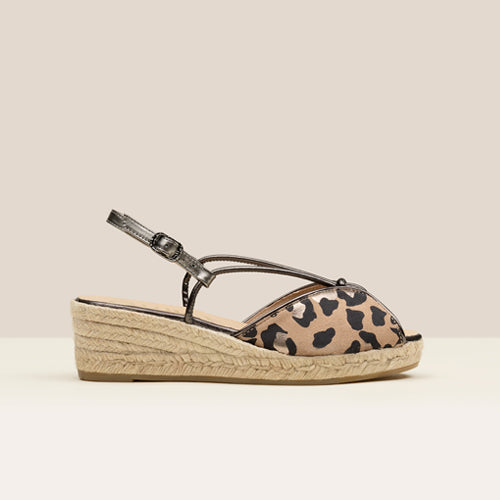 Alpargata con cuña de la marca Gaimo. Confeccionada en piel suave nobuk con estampado leopardo. Diseño de corte abierto con elegantes tiras acolchadas de piel metalizada. Cierre mediante tira con hebilla ajustable. Modelo de puntera redonda. Forro y plantilla de piel. Suela de goma.