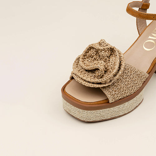 Alpargata con plataforma y tacón de la marca Gaimo. Confeccionada en rafia efecto natural color camel. Original adorno en forma de flor en la parte delantera. Cierre mediante tira con hebilla ajustable a la altura del tobillo en color cuero. Tacón y plataforma en yute natural. Modelo de puntera cuadrada. Elaboradas artesanalmente en Arnedo, España, con materiales de alta calidad y 100% naturales, son la opción perfecta para quienes buscan elevar sus looks veraniegos.