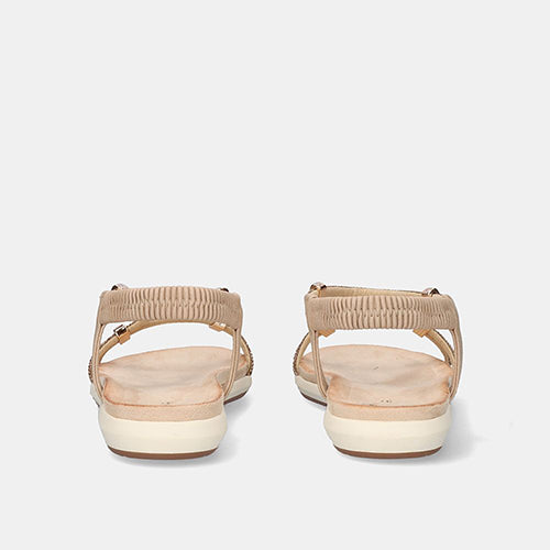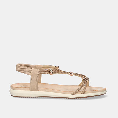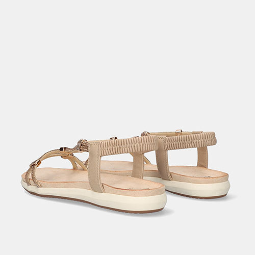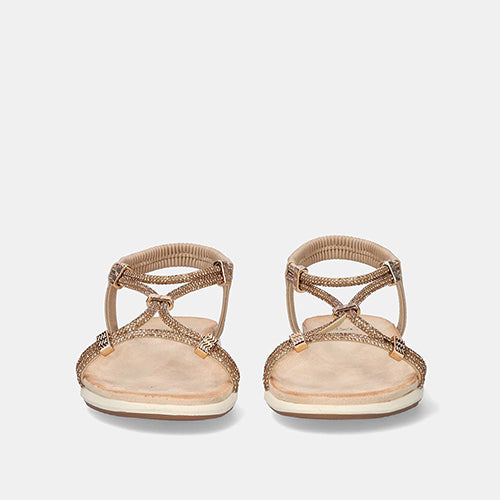 Sandalia plana de la marca EXE. Fabricada en material sintético en color oro. Plantilla textil. Modelo de tiras con brillantes en strass. Tira trasera elástica en color beige para un perfecto ajuste. Suela de goma.