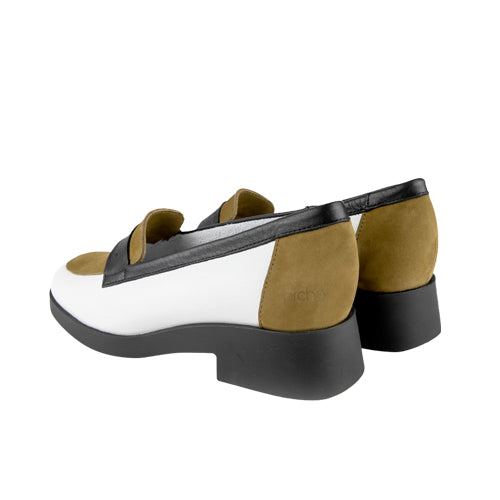 Mocasín de la marca arche. Fabricado en piel nobuk color marrón y piel granulada color blanco. Detalle de antifaz y piso en color negro. Contrafuerte y empeine en color marrón. Suela de goma con tacón. Plantilla de piel en color blanco.