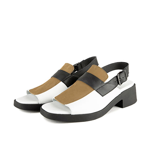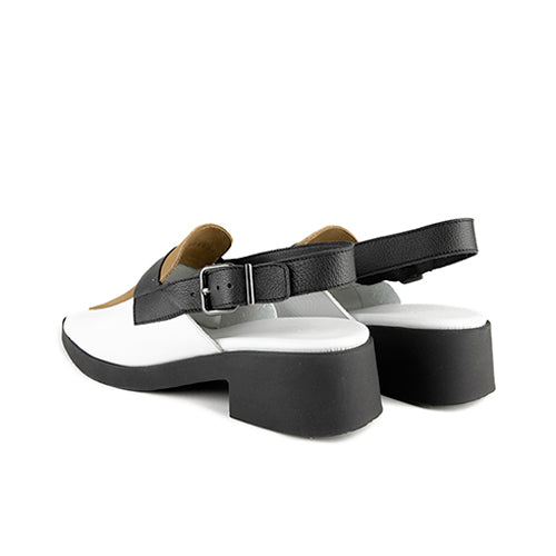 Zapato semi-abierto de la marca arche. Fabricado en combinación de piel nobuk color marrón y piel granulada color blanco. Detalle de antifaz y piso en color negro. Cierre mediante tira en color negro con hebilla ajustable para un ajuste perfecto. Plantilla de piel en color blanco. Suela de goma con tacón.