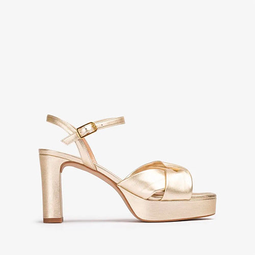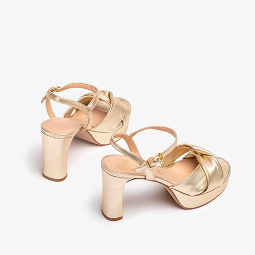 Sandalia de plataforma y tacón alto de la marca Unisa. Fabricada en piel metalizada color platino. Modelo de tiras anchas cruzadas en la parte delantera. Cierre mediante tira con hebilla ajustable. Diseño de puntera redonda. Plataforma y tacón en piel forrados al tono. Suela de goma ligera y antideslizante.