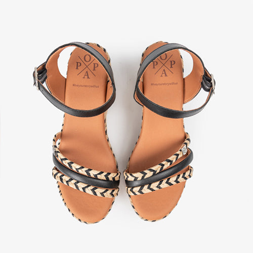 Sandalia de plataforma y cuña de la marca Popa. Fabricada en piel color negro con combinación de detalles en cuerda. Plantilla acolchada. Cierre mediante tira con hebilla ajustable a la altura del tobillo. Plataforma y cuña en yute natural. Suela de goma.