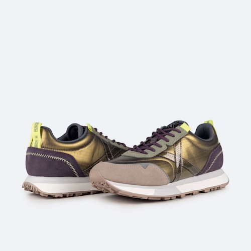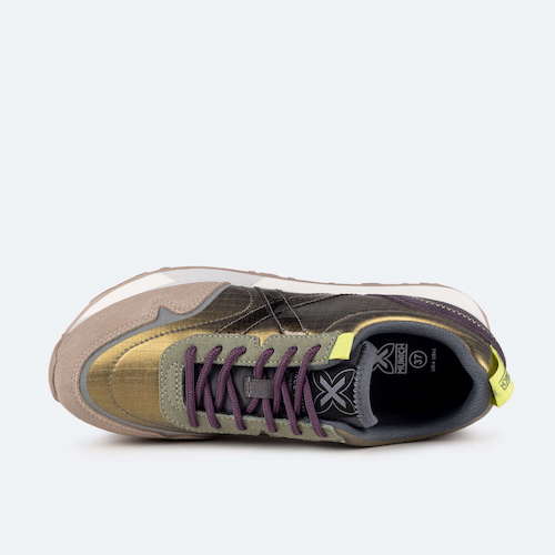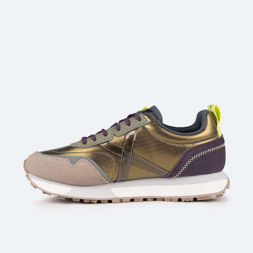 Deportiva con cordones Munich. Combinación de materiales en el corte, con piel nobuk color beige, lila y kaki y tejido técnico en color bronce. Detalle de tirador en color amarillo flúor. Símbolo de la marca en los laterales al tono. Incluye logo en color negro en la lengüeta. Piso bicolor. Suela de goma.