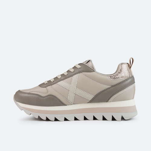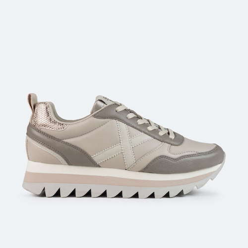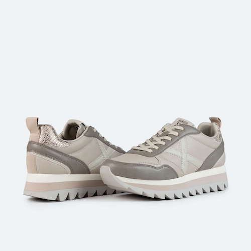Deportiva Munich con suela volumen en color taupe. Detalles en colores nude y beige. Contraste de materiales en el corte. Cierre mediante cordones. Tirador en la parte trasera. Sneakers con piso extra voluminoso y huella dentada. Plantilla extraíble.