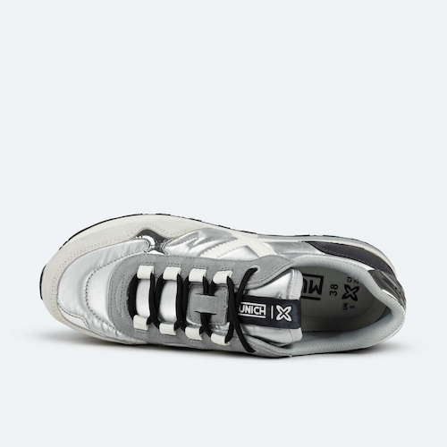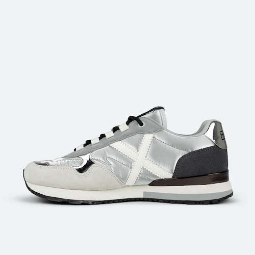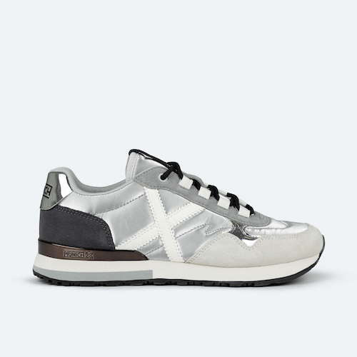 Deportiva con cordones Munich. Combinación de materiales en el corte, con piel nobuk color gris y tejido técnico en color plata. Incluye logo en color negro en la lengüeta y en el contrafuerte del modelo. Contrafuerte en color plata. Pieza metálica en la parte trasera del modelo. Piso tricolor. Suela de goma.