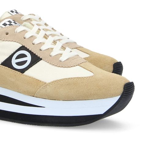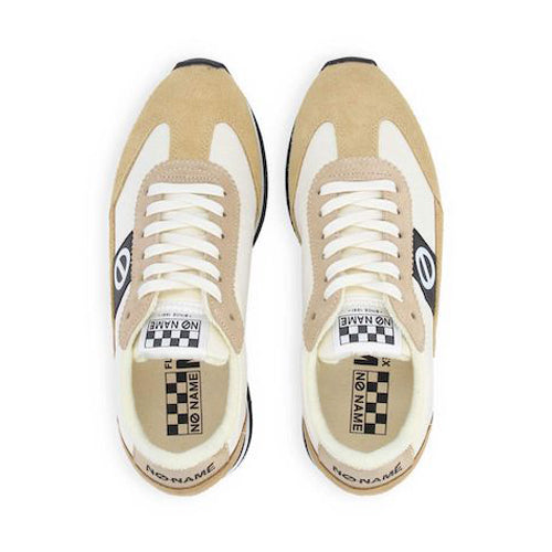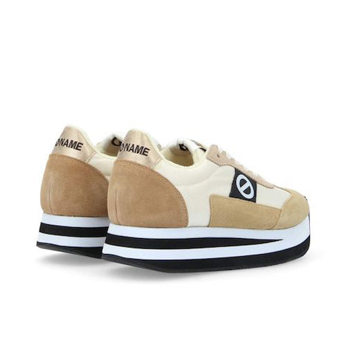 Deportiva con plataforma de la marca NO NAME. Fabricada en combinación de materiales en textil y sintético, con piezas de corte en piel nobuk. Modelo en tonalidades camel y beige hielo. Detalle de logo en los laterales. Contrafuerte en color dorado con nombre de marca en color negro. Forro de poliéster orgánico que garantiza una comodidad inigualable. Plantilla extraíble de algodón orgánico. Piso bicolor en blanco y negro. Flexible entresuela de EVA y suela de goma.