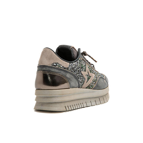 Deportiva con cordones de la marca Cetti. Fabricada con piezas de corte en piel nobuk color taupe, piel gris y glitter. Detalle de logo situado en la parte lateral del modelo. Contrafuerte en piel color taupe. Suela volumen dentada. Cierre mediante cordones elásticos. Forro textil. Plantilla acolchada y extraíble.