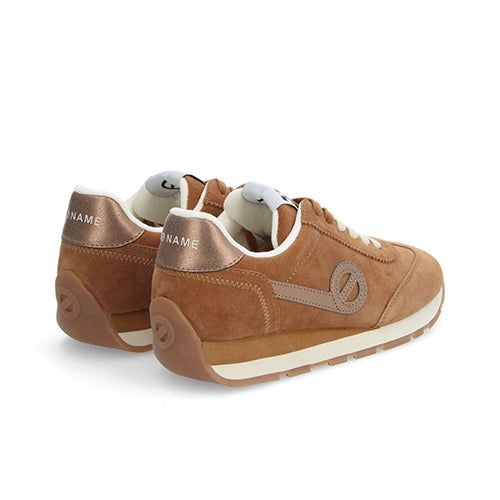 Deportiva con cordones de la marca NO NAME. Modelo City Run Jogger. Fabricada en piel nobuk color cuero. Detalle de anagrama en los laterales en piel color bronce. Contrafuerte en piel color bronce con marca en blanco . Forro 100% poliéster. Plantilla extraíble de algodón orgánico con certificación GOTS. Suela EVA + caucho, fina y ultra-cómoda que la convierten en un imprescindible para pasear por la ciudad con estilo.