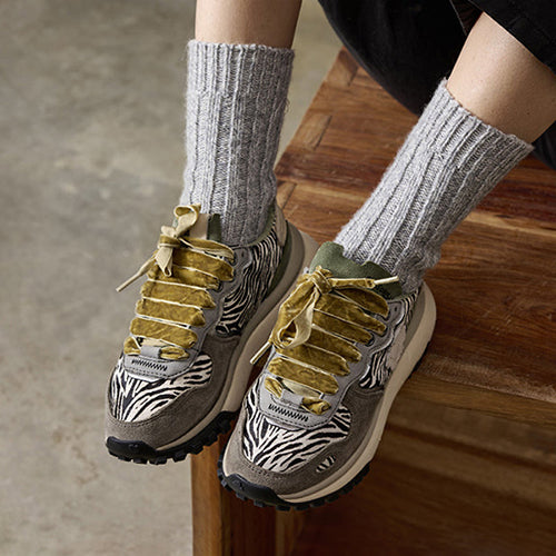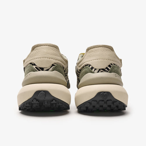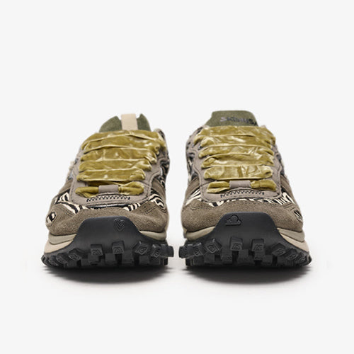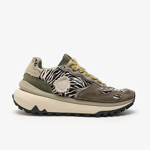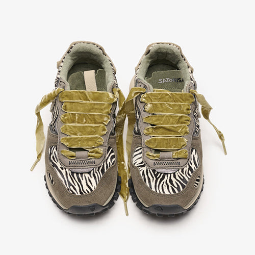 Deportiva de la marca Satorisan. Modelo reinterpretación Chacrona con nueva suela Metta Love, elaborado en contacto con la naturaleza gracias a sus materiales conscientes y de alta calidad, beneficiando a tus pies y al planeta. Diseño en animal print combinado colores gris, kaki y negro. Detalle de marca en la lengüeta y parte lateral posterior. Doble juego de cordones, uno en tencel color ocre y otro en algodón color beige.