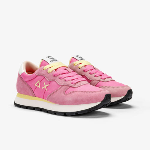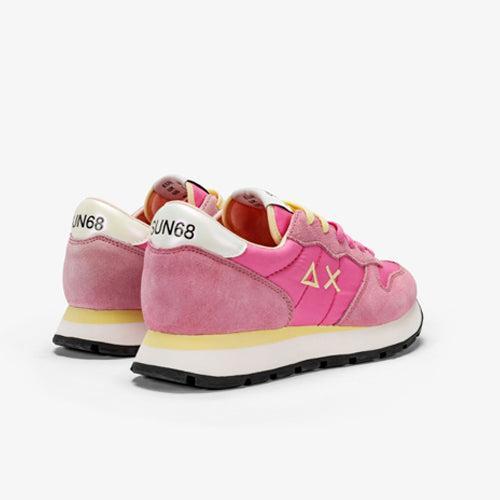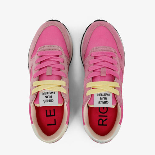 Deportiva con cordones de la marca SUN68. Fabricada en piezas de corte combinando piel y tejido nylon. Modelo en color fucsia con detalles en amarillo y blanco. Anagrama en el lateral exterior del modelo en color amarillo. Detalle de marca situado en talonera. Lengüeta al tono que incluye mensaje: Girls run faster. Cierre mediante cordones, con dos opciones de color: amarillo o fucsia. Suela de goma con piso en bicolor. Plantilla extraíble.