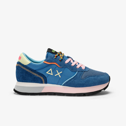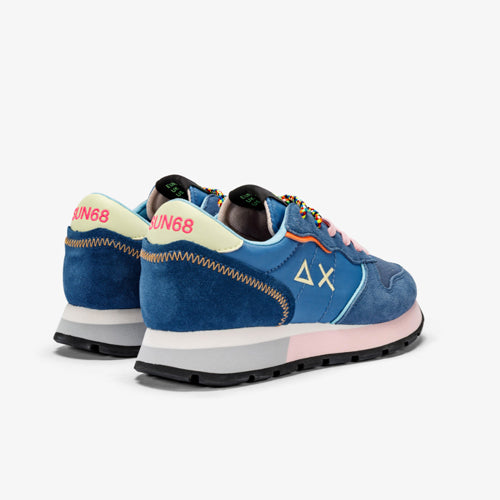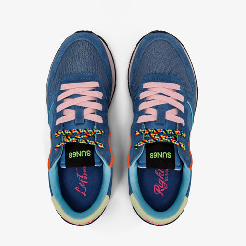 Deportiva con cordones de la marca SUN68. Fabricada en piezas de corte combinando piel, tejido nylon y malla. Modelo en color jeans con detalles en orange y crema. Anagrama en el lateral exterior del modelo en color crema. Contrafuerte en color crema con detalle de marca en color fucsia. Cierre mediante cordones, con dos opciones de color: rosa y multicolor. Suela de goma con piso en tricolor: rosa, gris y blanco. Plantilla extraíble.