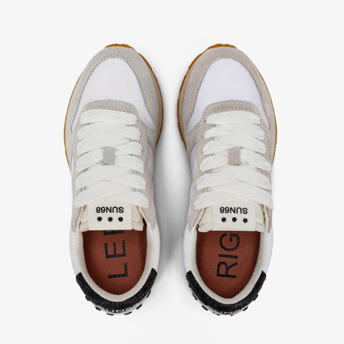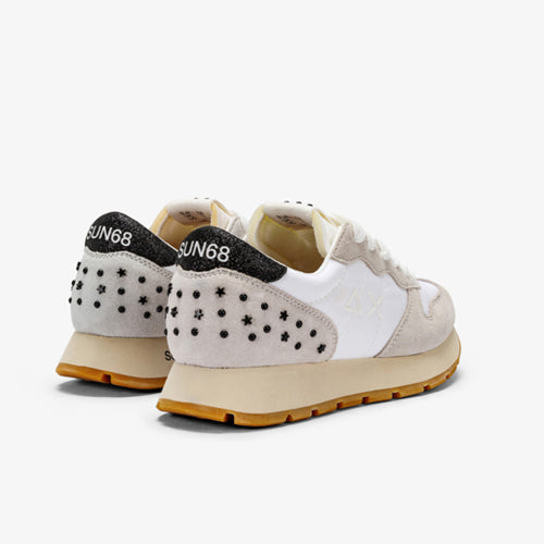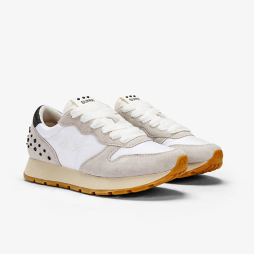 Deportiva con cordones de la marca SUN68. Fabricada en piezas de corte combinando piel y tejido nylon. Modelo en color blanco con detalles en contraste color negro. Anagrama en el lateral exterior del modelo en color blanco. Detalle de marca situado en talonera y tachas en forma de bolitas y estrellas. Incluye marca en la lengüeta. Contrafuerte en glitter color negro. Cierre mediante cordones al tono. Suela de goma con piso en beige. Plantilla extraíble.