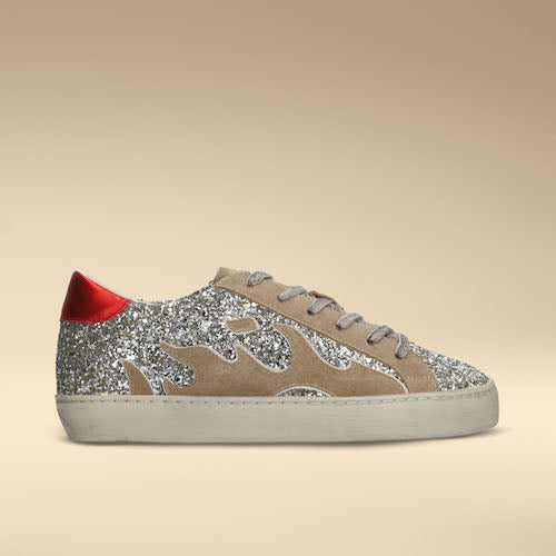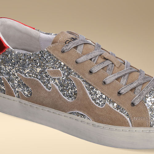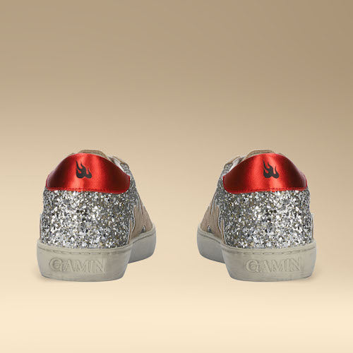 Deportiva con cordones modelo Gamin Dopamine. Fabricada en glitter color plata con puntera redonda. Detalle de llama en ante color taupe. Contrafuerte en piel color rojo metalizado. Cierre mediante cordones grises efecto desgastado. Suela de goma.