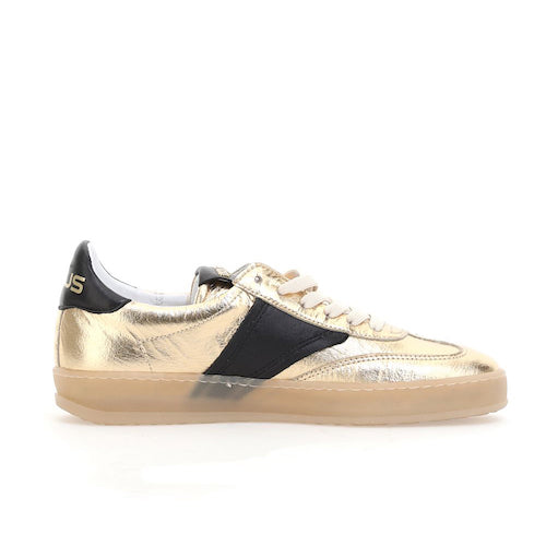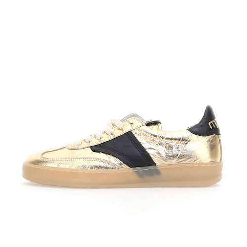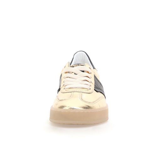 Deportiva de cordones de la marca Mjus. Fabricada en piel, combina color oro con detalles en negro. Detalle de marca en el contrafuerte del modelo en color oro. Diseño contemporáneo con un toque brillo, que consigue un equilibrio perfecto entre comodidad y sofisticación. Piso transparente al tono. Suela de goma.