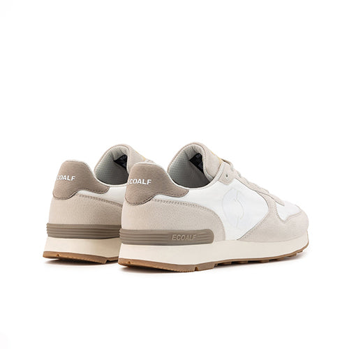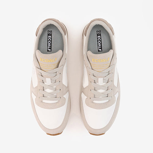 Deportiva de la marca Ecoalf en color blanco. El modelo Ucla combina un diseño contemporáneo y sostenible. Fabricada con un 100% de poliamida reciclada en su tejido principal y piezas de corte en ante vegano color beige. Detalle de símbolo de marca en el lateral al tono y contrafuerte en color taupe con marca al contraste. La poliamida reciclada consigue importantes ahorros de CO2 y agua, así como dar una segunda vida a los residuos. Su plantilla, compuesta por 70% EVA y 30% EVA reciclada, aseguran comodidad y un estilo versátil, perfecto para cualquier ocasión.