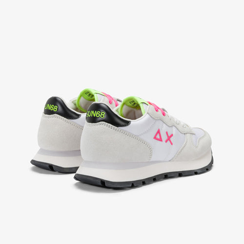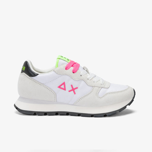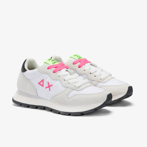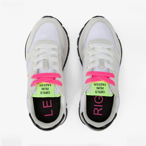 Deportiva con cordones de la marca SUN68. Fabricada en piezas de corte combinando piel y tejido nylon. Modelo en color blanco con detalles en fucsia y amarillo flúor. Anagrama en el lateral exterior del modelo en color fucsia. Talonera en color negro con detalle de marca en color flúor. Lengüeta en color flúor que incluye mensaje: Girls run faster. Cierre mediante cordones, con dos opciones de color: blanco o fucsia. Suela de goma con piso en bicolor. Plantilla extraíble.