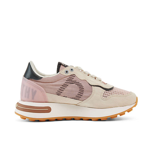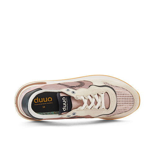 Deportiva de cordones de la marca duuo. Fabricada en materiales sostenibles, con reflejos metálicos en color rosa. Símbolo de marca situado en los laterales en color negro. Contrafuerte en color negro. Detalle de marca situdado en parte trasera y lengüeta. Cordones elásticos que permiten un ajuste seguro y cómodo. Este modelo utiliza hilo reciclado para el forro y plantillas extraíbles recicladas.