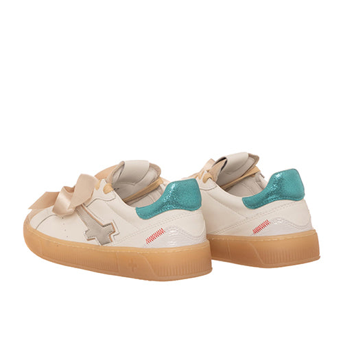 Deportiva de la marca Gio+. Fabricada en piel color blanco. Detalle en lateral exterior en color plata. Puntera y lengüeta en piel nobuk beige. Contrafuerte en color celeste metalizado. Cierre mediante cordones en color beige. Detalle lazo en raso tipo charm con adornos de fantasía.