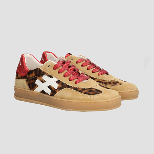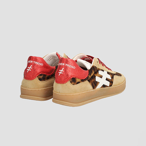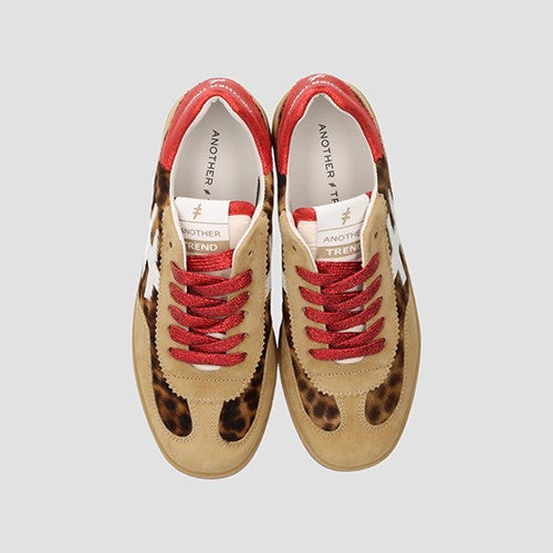 Deportiva de la marca Another Trend. La nueva Iconic combina estilo y comodidad en cada paso. Fabricada en combinación de materiales, con pelo estampado animal print y piezas de corte en piel color camel. Detalle de logotipo en laterales en piel color blanco. Contrafuerte en rojo con nombre de marca al contraste. Cierre mediante cordones. Suela de goma flexible. Incluye dos juegos de cordones: uno en color rojo metalizado y otro en color camel.