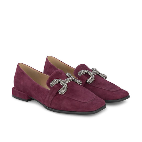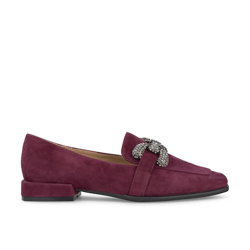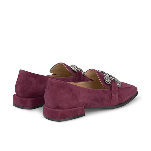 Mocasín plano de la marca Alma en Pena. Fabricado en piel nobuk burdeos. Antifaz con adorno de pedrería. Modelo de puntera cuadrada. Tacón forrado al tono.