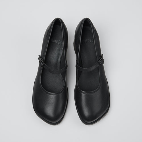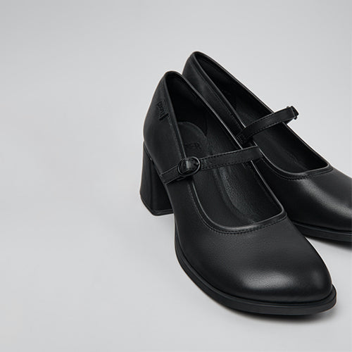 Zapato estilo merceditas de la marca Camper. Fabricados en piel color negro. Cierre mediante tira con hebilla ajustable. Modelo de medio tacón forrado al tono. Plantillas OrthoLite® Recycled™ y suelas de goma y ABS.