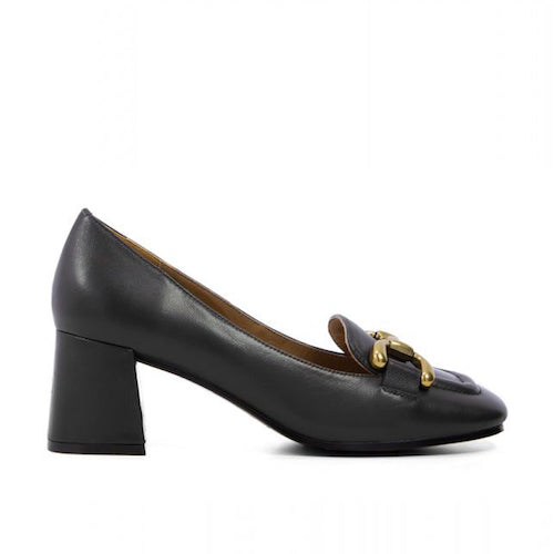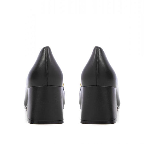 Mocasín de tacón medio de la marca Bibi Lou. Fabricado en piel color negro. Modelo de puntera cuadrada. Antifaz con detalle de pieza dorada. Tacón bloque forrado en piel al tono.