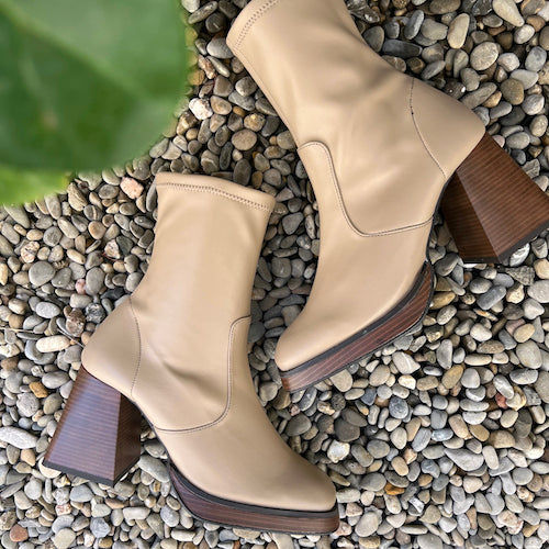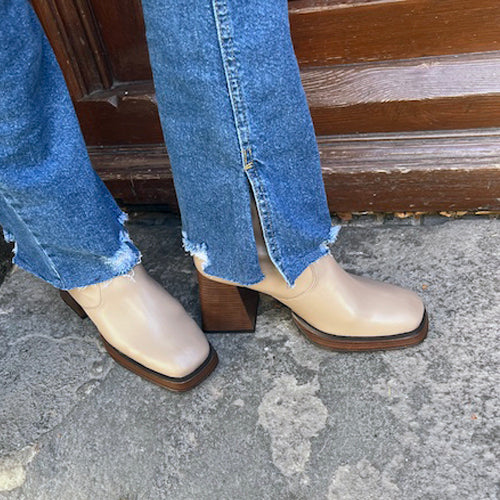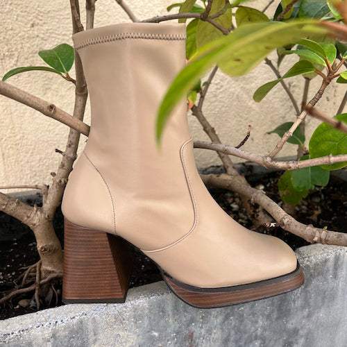 Botín con plataforma y tacón de la marca Itse. Fabricado en material elástico color beige. Tacón alto, ancho y de forma geométrica (trapecio). Plataforma y tacón forrado en material tipo madera. Suela de goma. Plantilla de piel. Un modelo muy cómodo que se adapta perfectamente a la pierna.