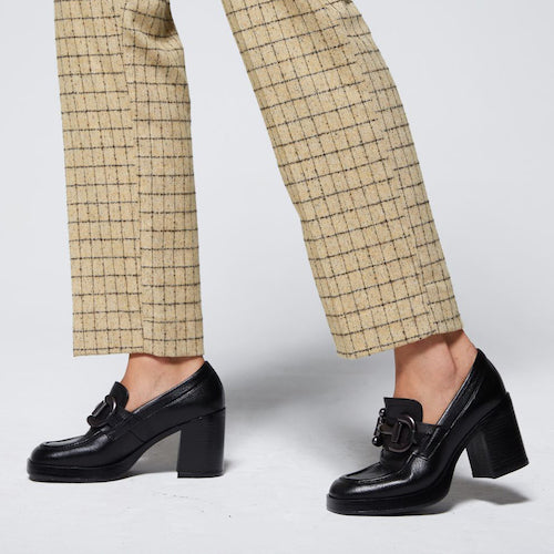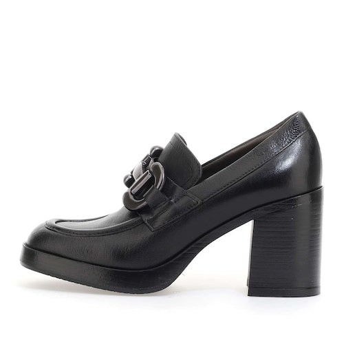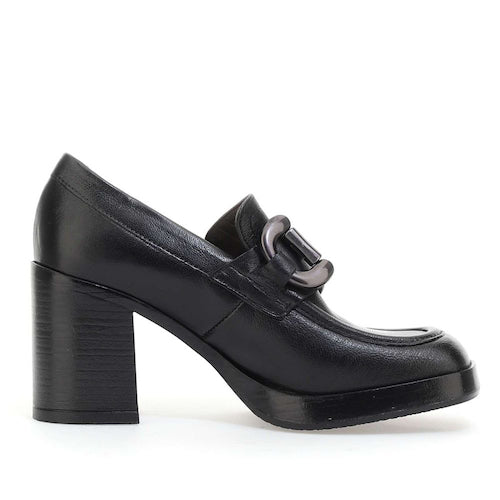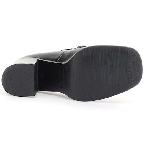 Mocasín de tacón alto de la marca itse. Fabricado en piel color negro. Antifaz con detalle de hebilla en color plata oscura. Tacón bloque y suela de goma. Ligera plataforma que amortigua la pisada.