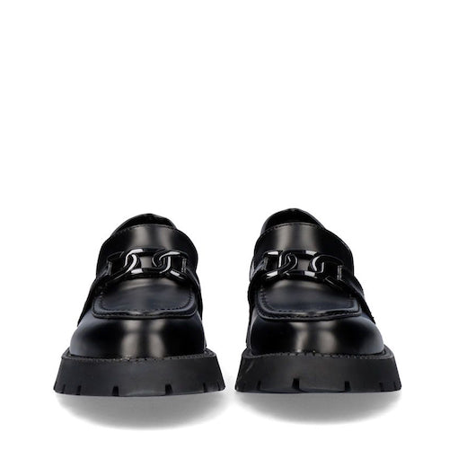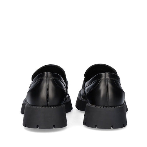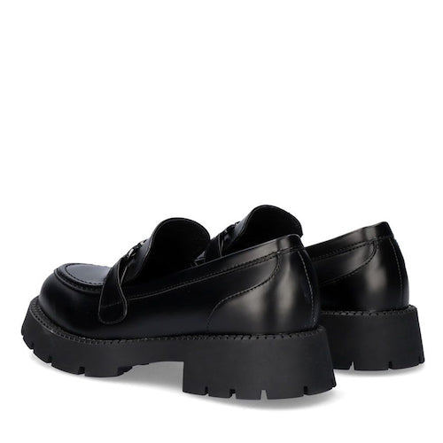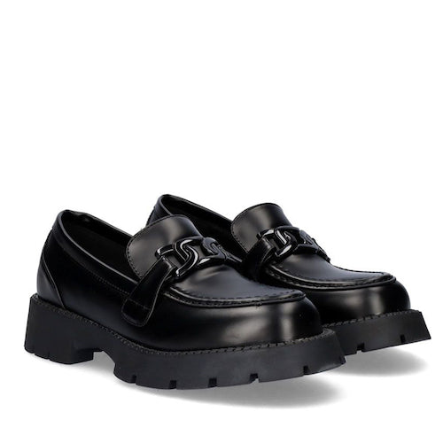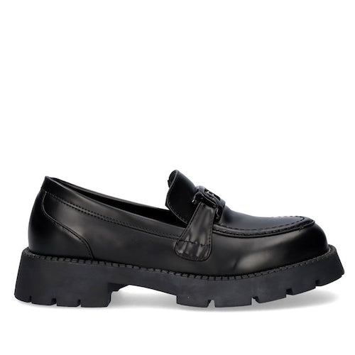 Mocasín de suela volumen de la marca EXE. Modelo en color negro con adorno al tono en el empeine. Corte y suela de material sintético y plantilla de piel.