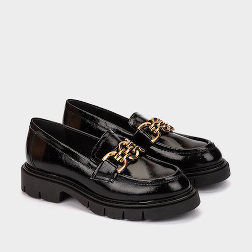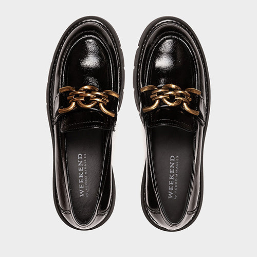Mocasín de la marca Weekend by Pedro Miralles. Fabricado en piel efecto charol en color negro. Diseño de líneas modernas con tacón y plataforma volumen. Detalle de adorno dorado situado en el empeine. Interior de piel y suela de goma dentada.