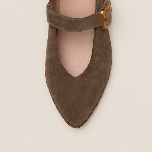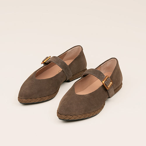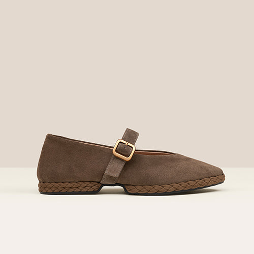 Bailarina estilo Mary Jane de la marca Gaimo. Fabricada en piel ante color taupe oscuro. Cierre mediante tira al tono con hebilla metálica ajustable. Plantilla y forro de piel. Piso con detalle de banda trenzada de piel al tono. Puntera afilada. Un modelo atemporal, femenino y sofisticado para tus looks de cada día.