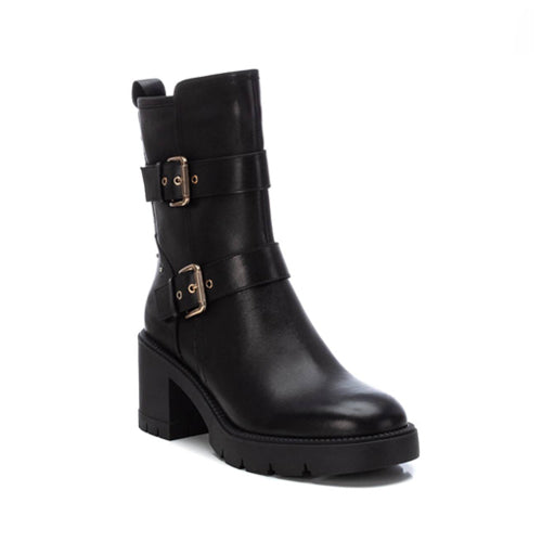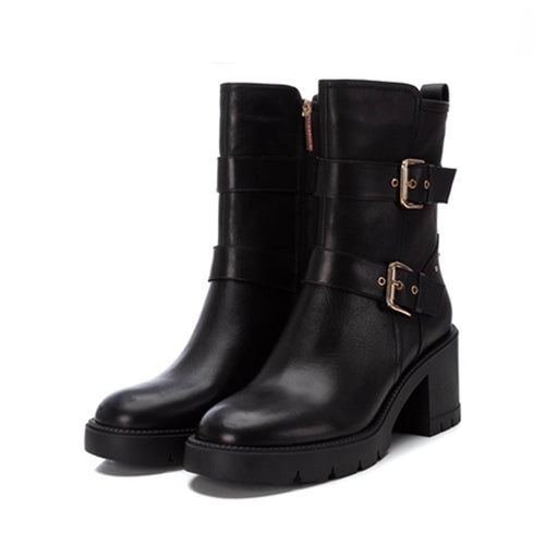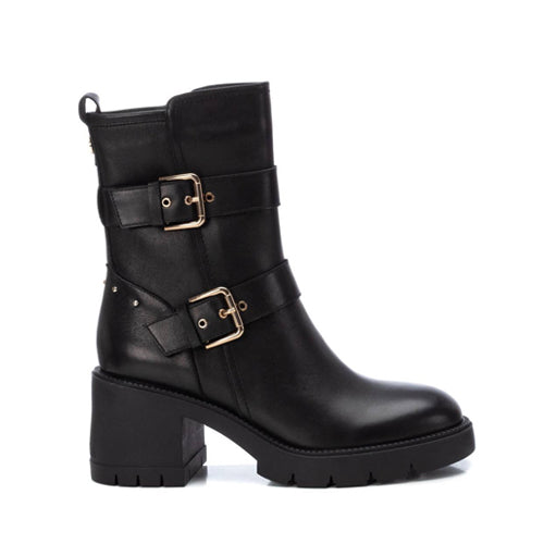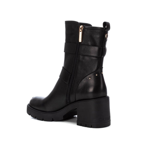 Botín de medio tacón de la marca Carmela. Fabricado en piel color negro. Cierre mediante cremallera situada en el lateral interior. Detalle de dos correas con hebilla en color dorado. Tacón tipo bloque. Tirador en la parte trasera para un mejor calce. Suela de goma antideslizante.
