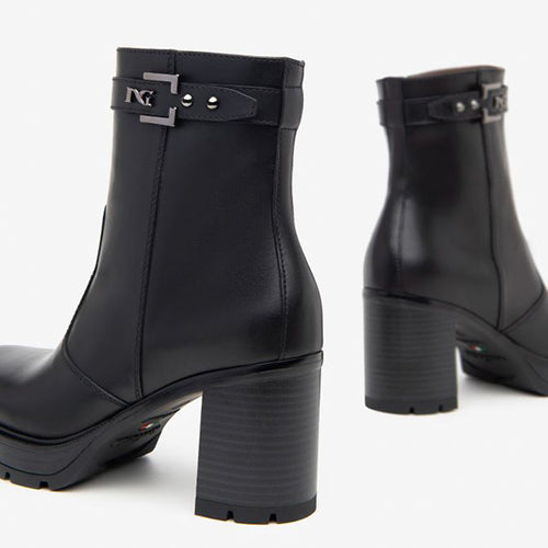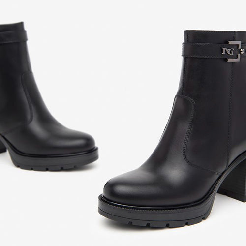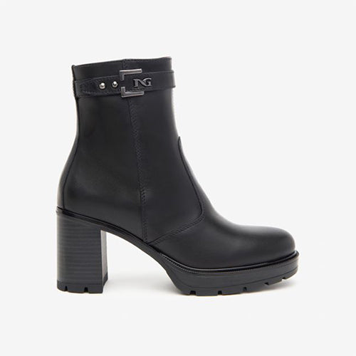 Botín de tacón y plataforma de la marca Nero Giardini. Fabricado en piel color negro. Cierre mediante cremallera situada en el lateral interior. Modelo de puntera redonda con tacón tipo bloque. Detalle metálico de logo NG en la parte superior. Interior de piel. Plantilla con tecnología DryGo!® absorbe la humedad y garantiza confort y bienestar. Suela de goma.