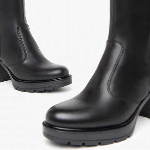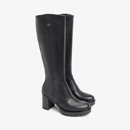 Bota de tacón y caña alta de la marca Nero Giardini. Fabricada en piel color negro. Cierre mediante cremallera en la parte lateral interna. Detalla de lago en la parte superior externa de la caña. Modelo de puntera redondeada. Plataforma y tacón bloque. Suela de goma dentada.